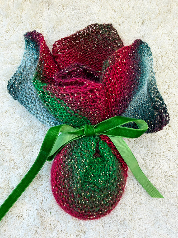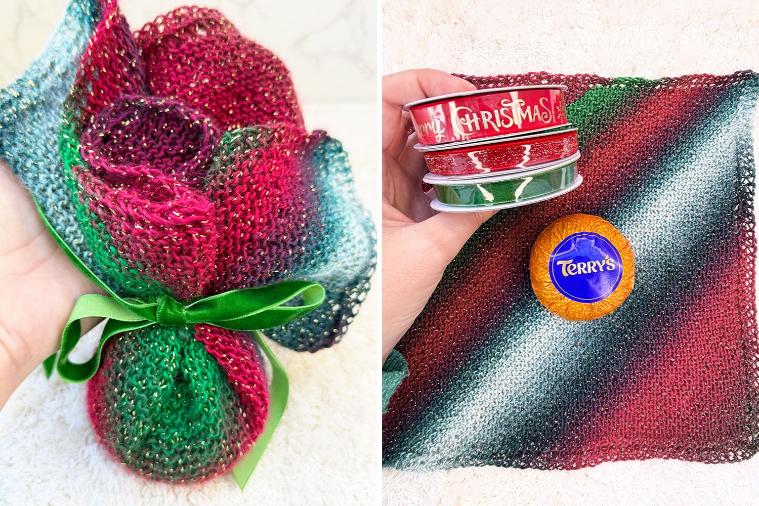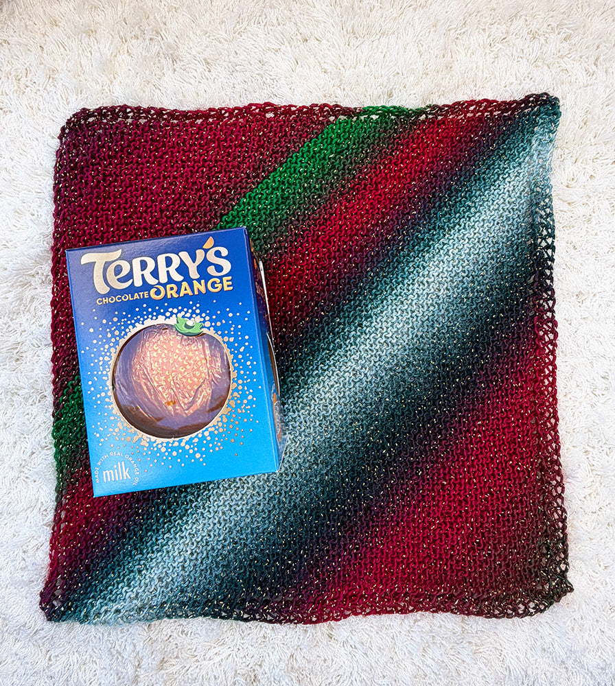 This charming diagonal garter square wraps around a Terry’s Chocolate Orange or Christmas ball ornaments and ties with ribbon for an instant gift.