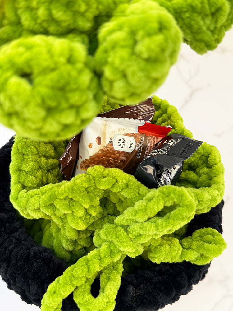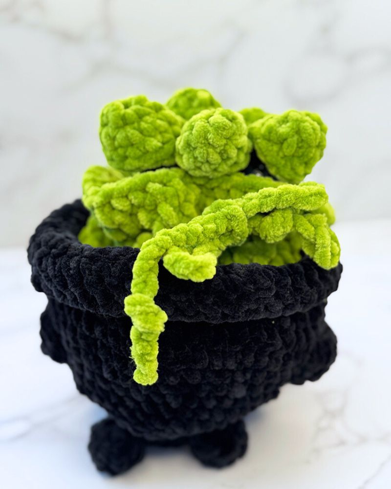 A cozy little crochet cauldron for Halloween treats, tabletop décor, or spooky storage!