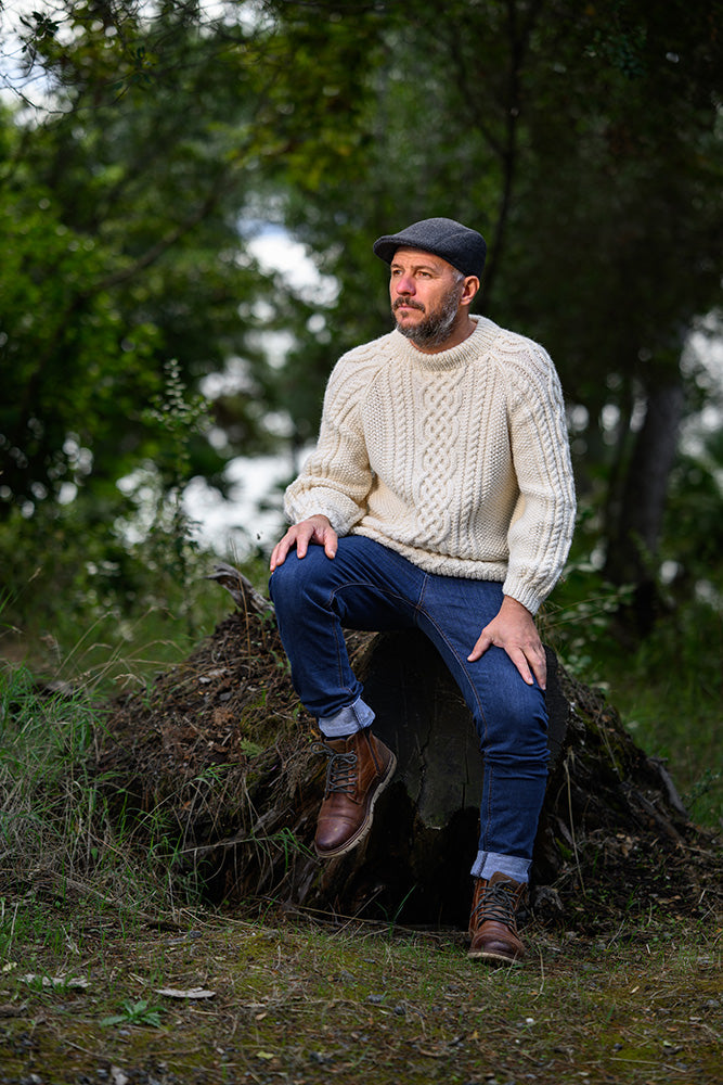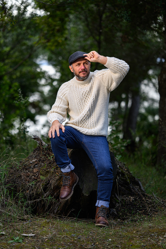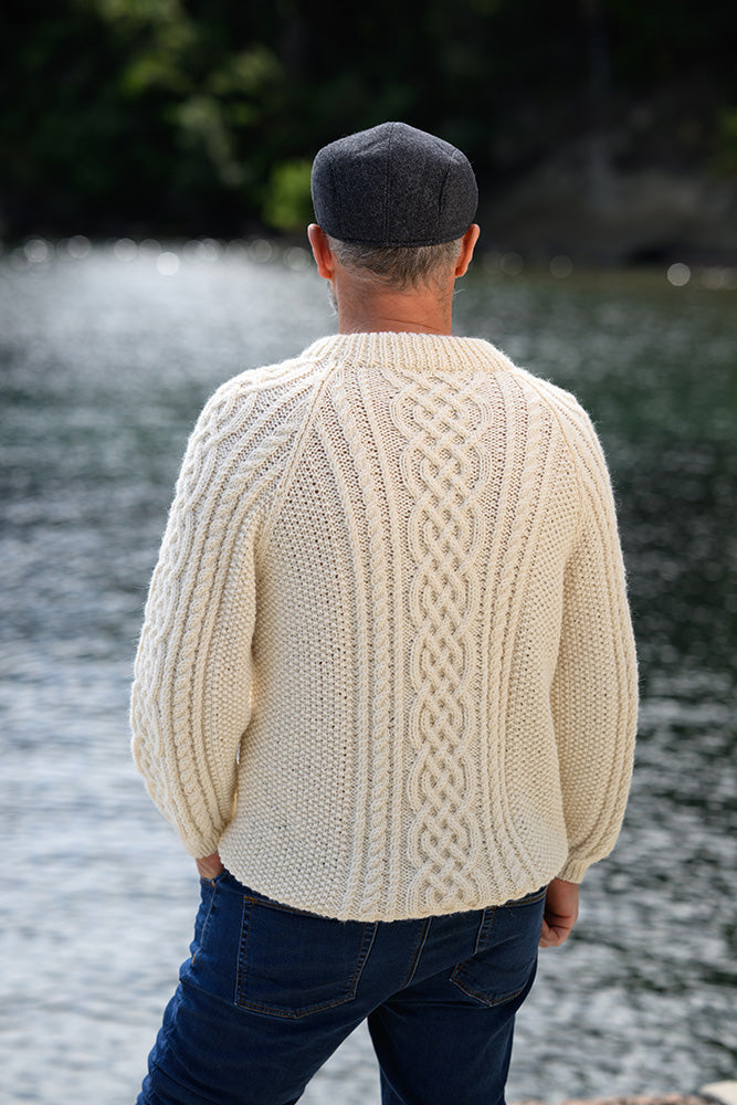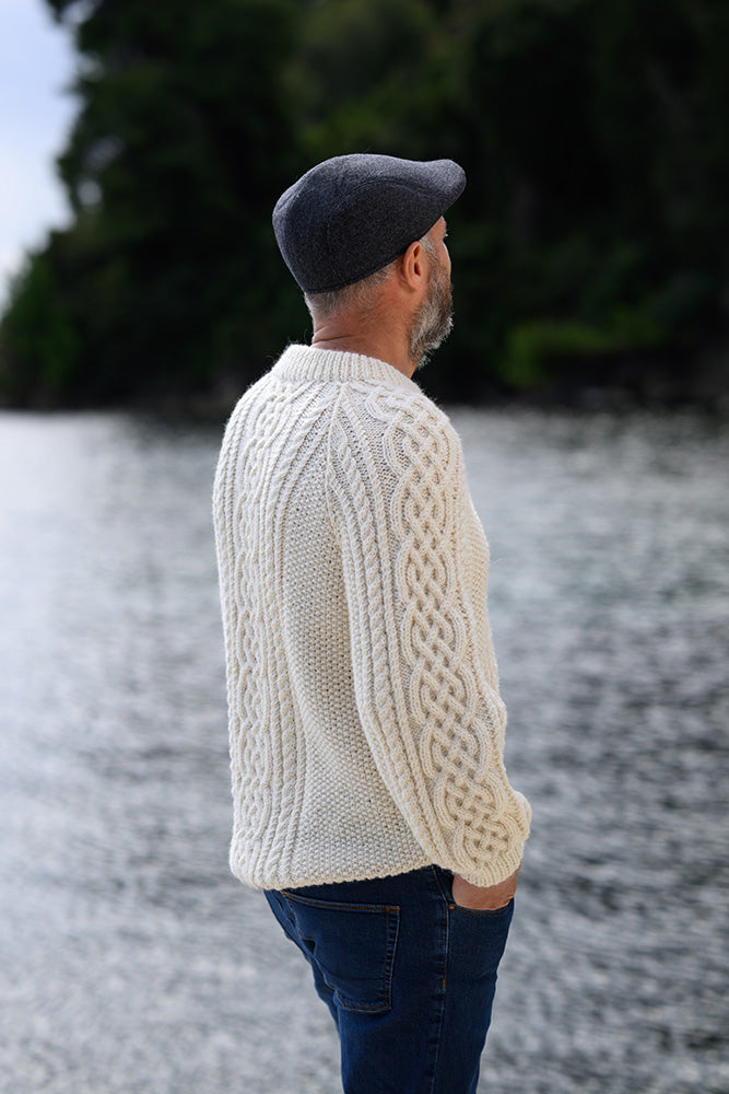 Knit a timeless fisherman sweater with this Celtic cable Aran sweater knitting pattern, designed in classic adult unisex sizing and shown here on a male model.