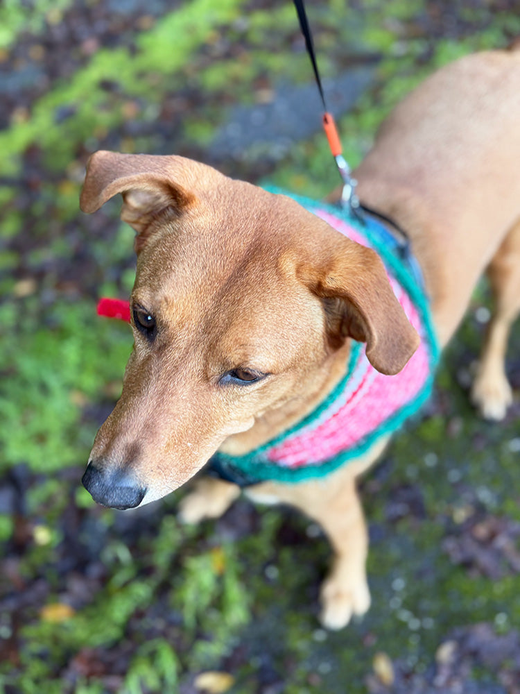 It’s worked in simple garter stitch from the tip up, with easy increases and long ties that knot comfortably behind your dog’s neck.