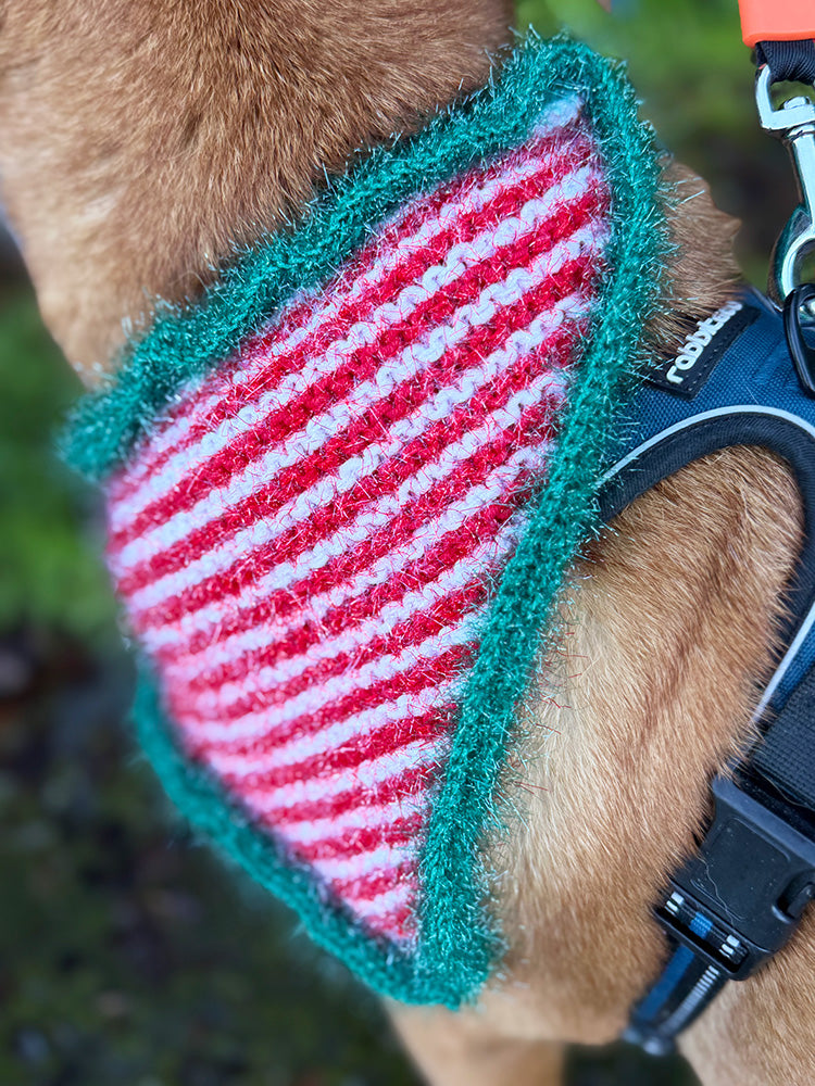This beginner-friendly knitting pattern shows you how to make an adorable striped elf-style dog bandana with classic red and white stripes, a fluffy green ruffle, and a touch of sparkle.