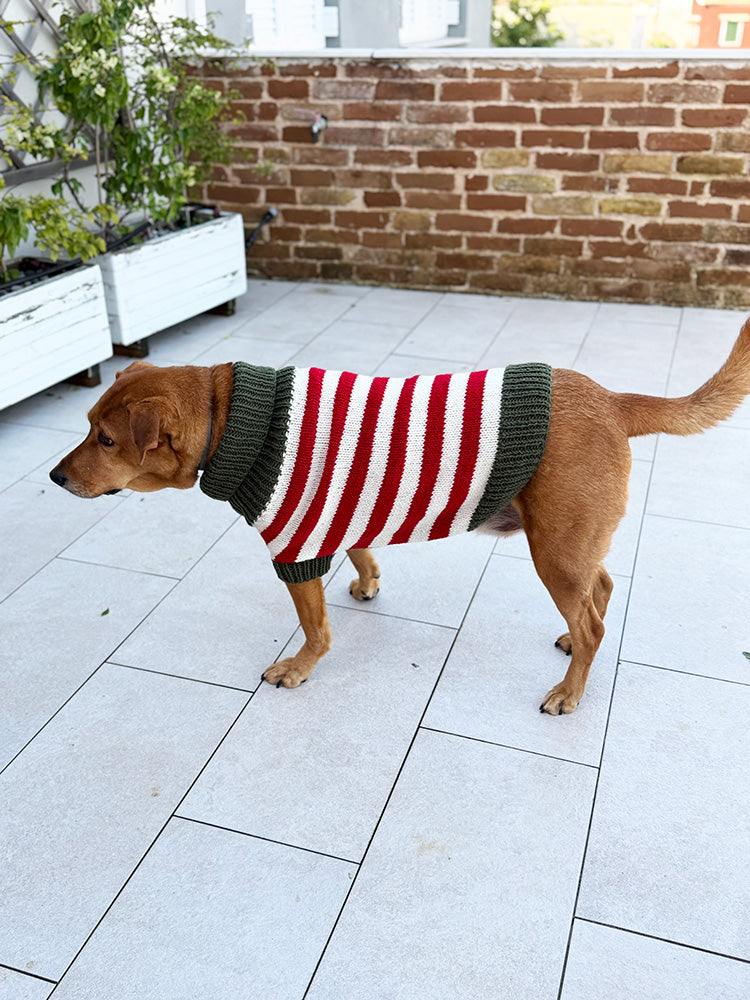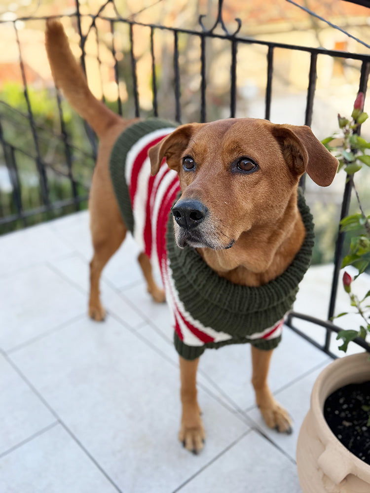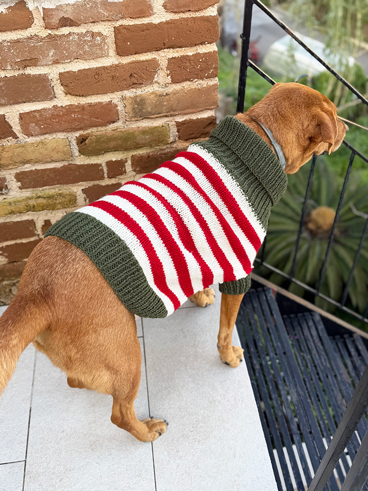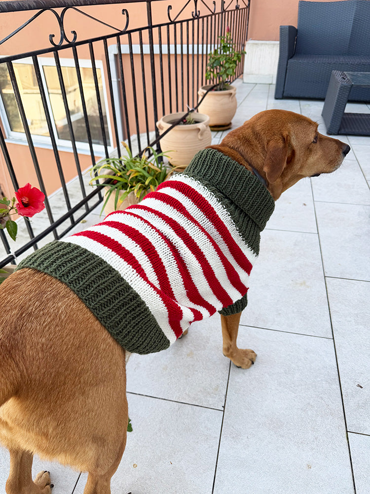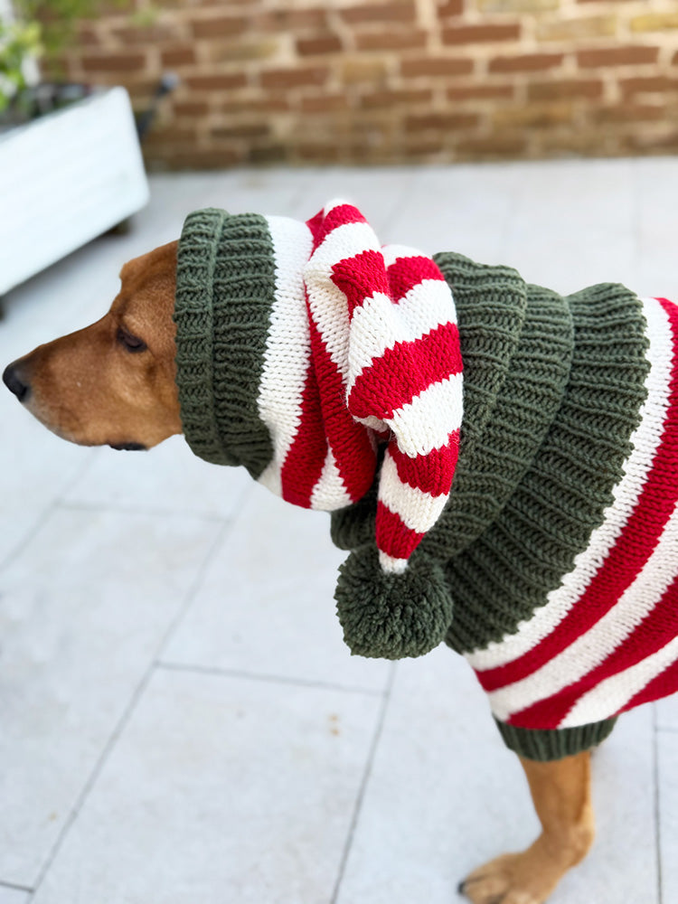 This festive knitted dog sweater features bold red, green, and white stripes, a cozy ribbed neck, and the option to add sleeves—perfect for winter walks, Christmas photos, and snuggly evenings at home.