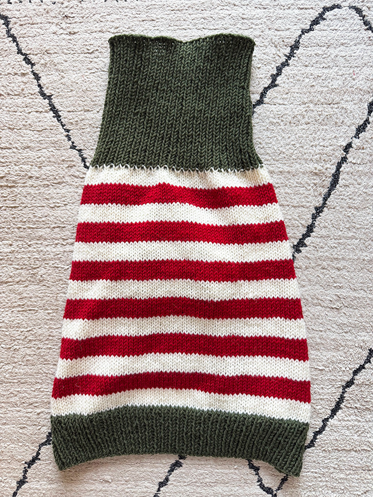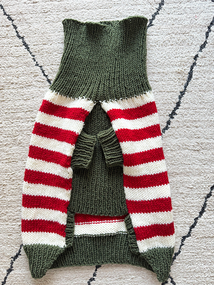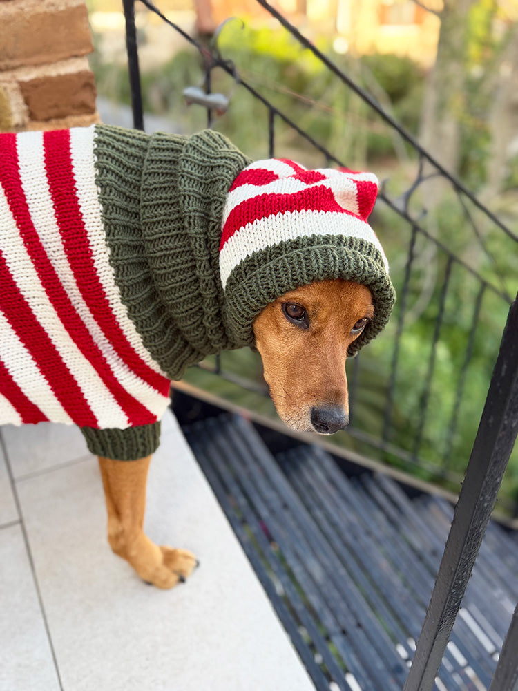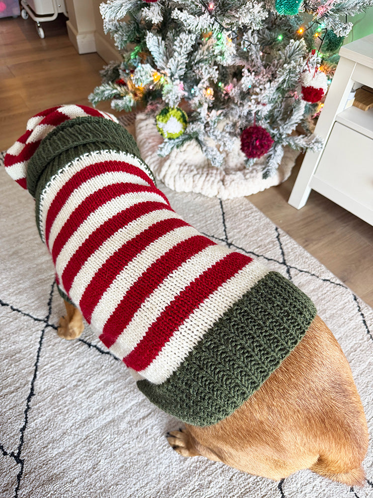 You can even use the same yarn to create a matching striped elf hat for your dog and complete the festive look.