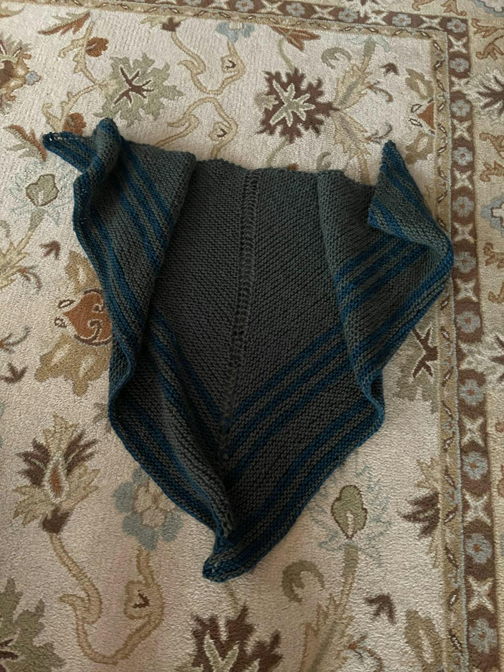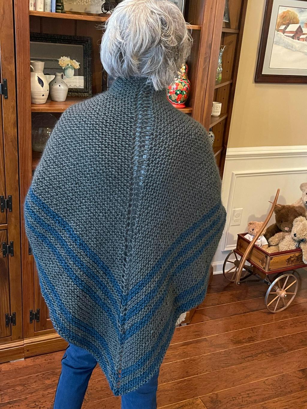 The shawl is designed to wrap around your body and tie at the back, creating a cozy, wearable crossover shape that stays in place.